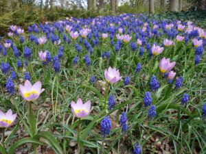 Het mixen van twee kleuren geeft een speels en wat natuurlijker effect. Zoals hieronder met de combinatie van blauwe druifjes en roze tulpen met een geel hartje. De kleuren blauw en roze harmoniëren prettig met elkaar.
